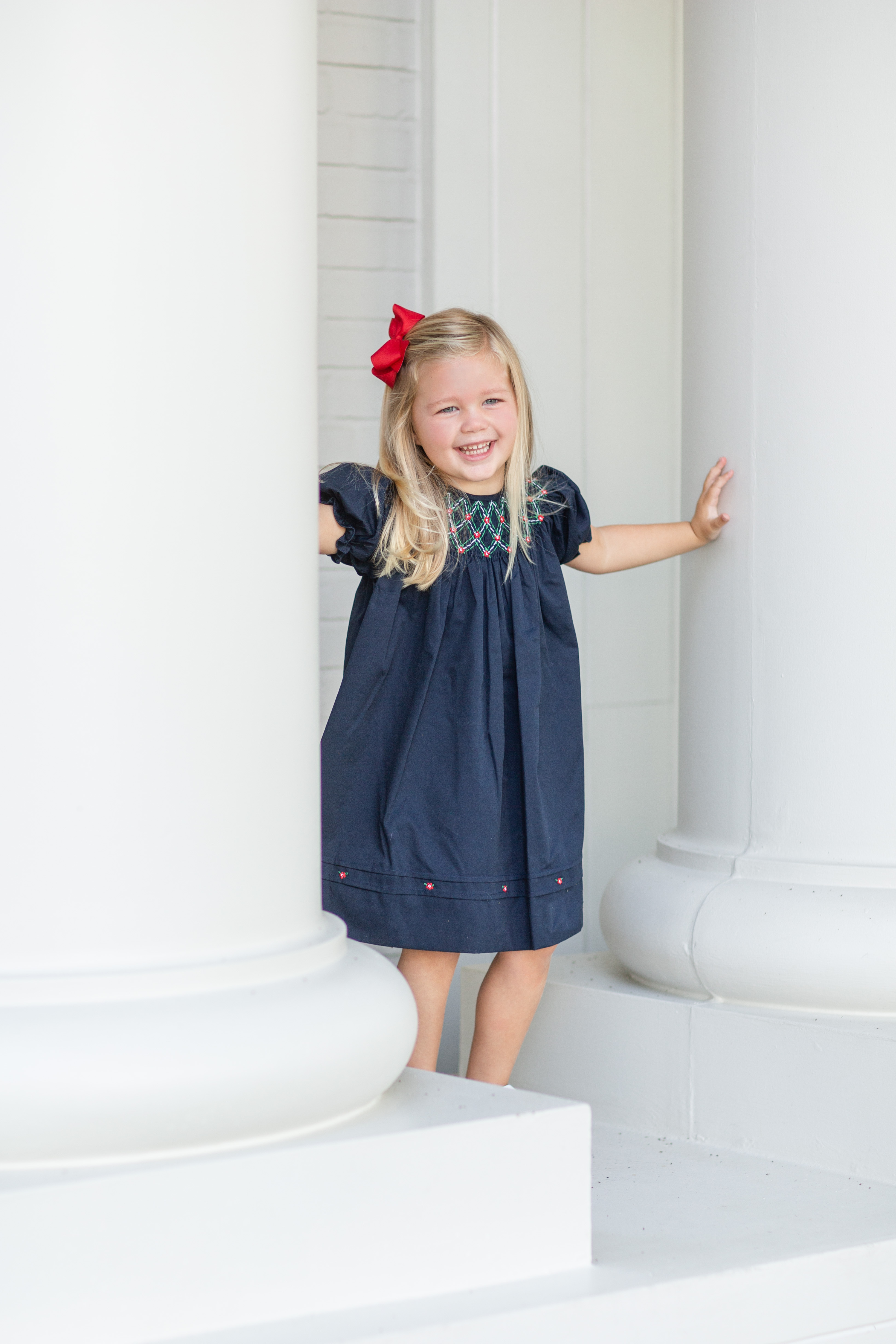 A nod to traditional red/green holiday tones, the Navy Bishop Dress offers a fresh twist by going neutral yet festive. It retains the signature smocked detailing, but in a deep navy that’s less overtly “holiday red,” making it an excellent option for families seeking elegance over color.