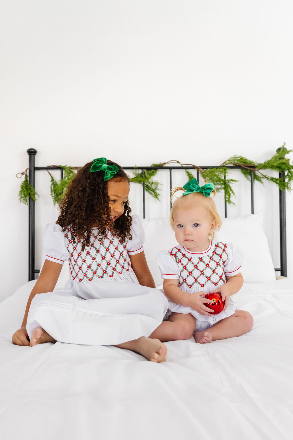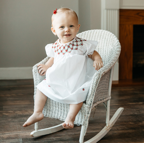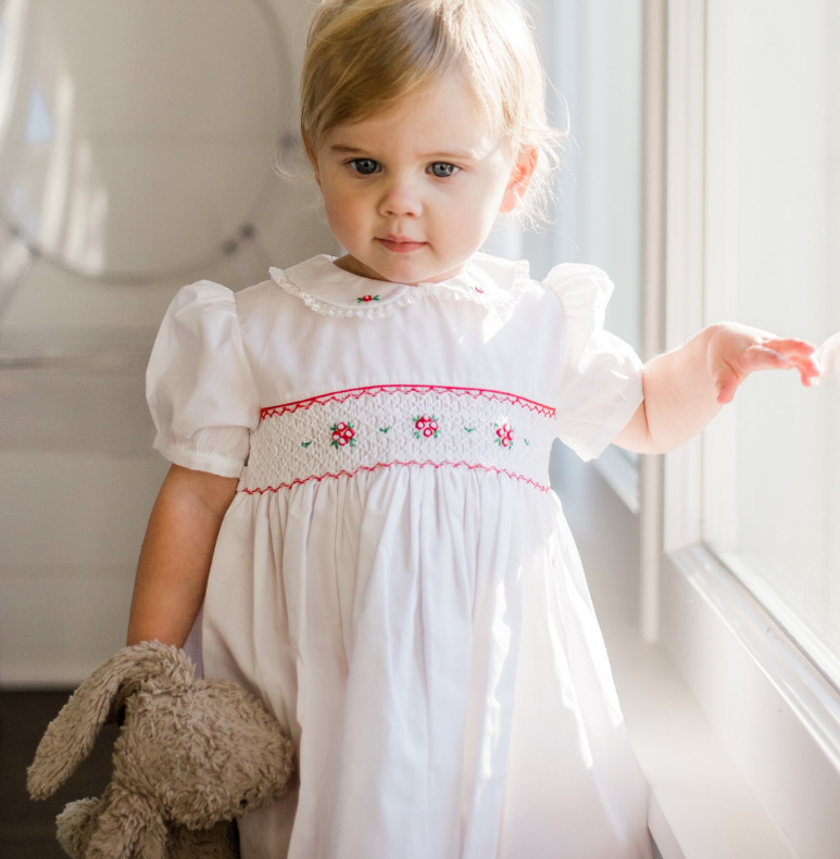 One of the most exciting additions for 2025, the Girls Holiday Garden Dress brings fresh styling into the Feltman holiday lineup. Its crisp white base, red smocking, and puff-sleeve silhouette deliver a garden-festive feel that feels both new and classic.