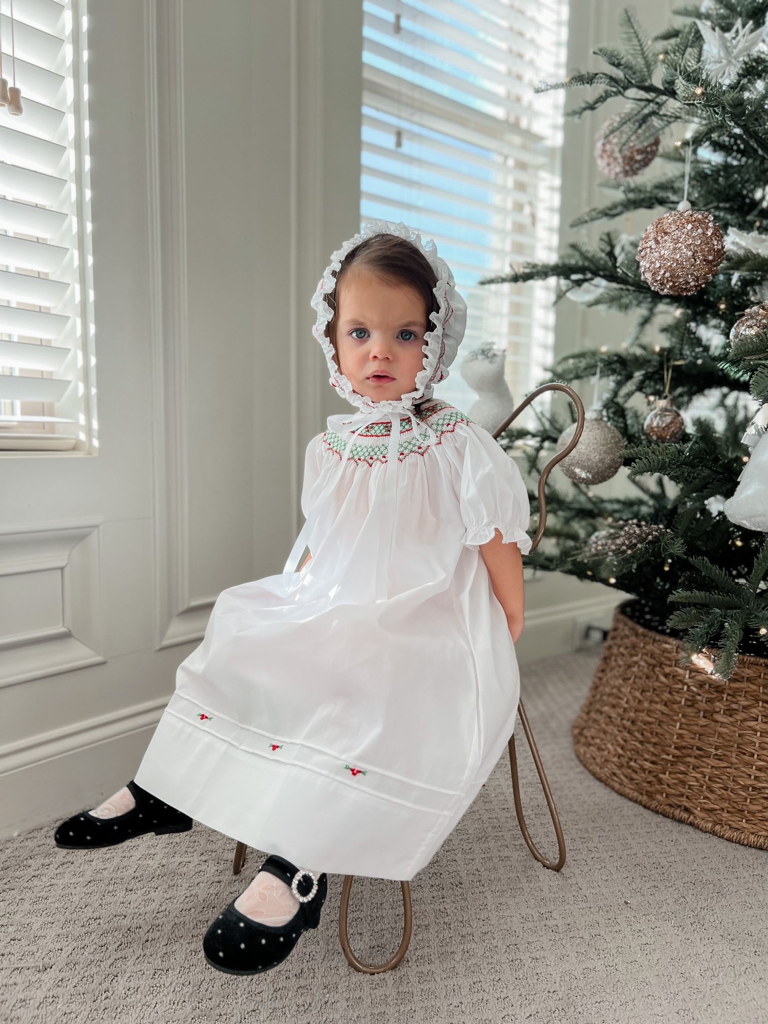 This is a classic in Feltman’s holiday line and remains a consistent top seller. It features hand-smocked detailing on the yoke, delicate bullion embroideries along the hem, and puffed short sleeves that balance formal elegance with comfort.